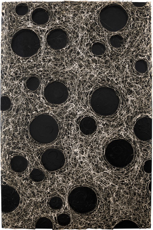 chiodi, nylon, silicone su tavola di legno